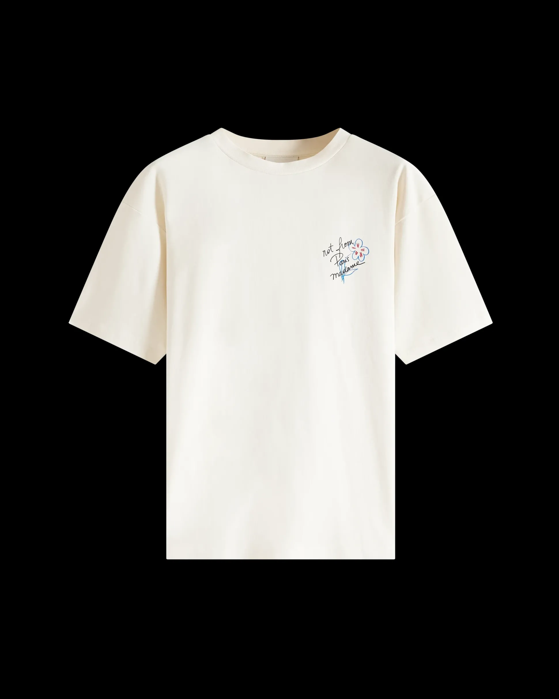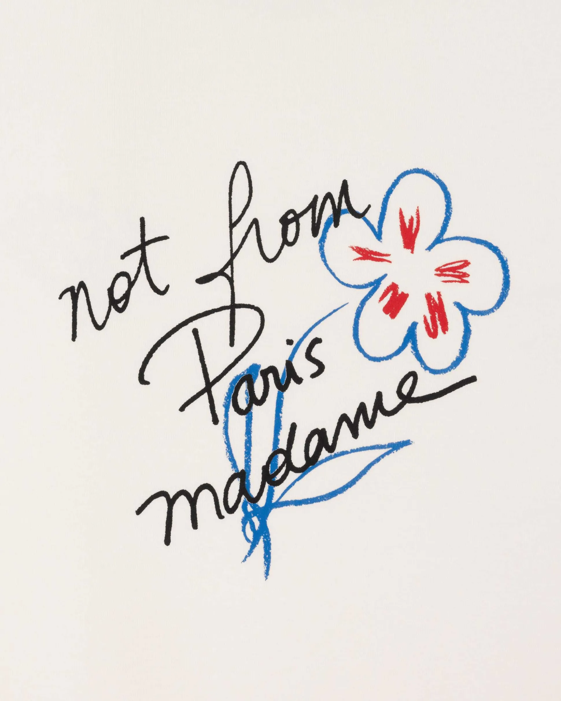 Handwritten message. This cream 100% cotton interlock t-shirt with a ribbed neckline is printed with the ‘Not From Paris Madame’ slogan front and back.