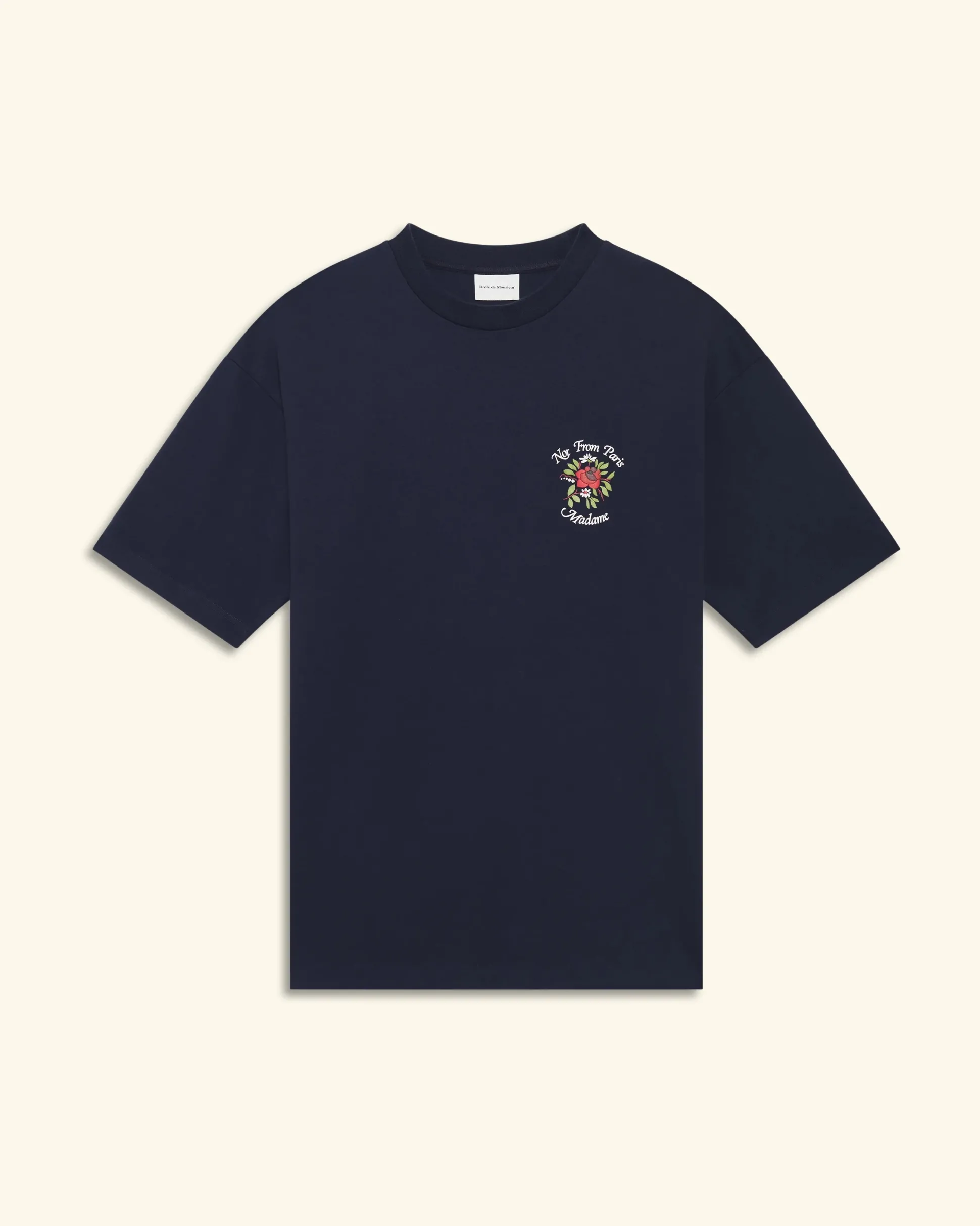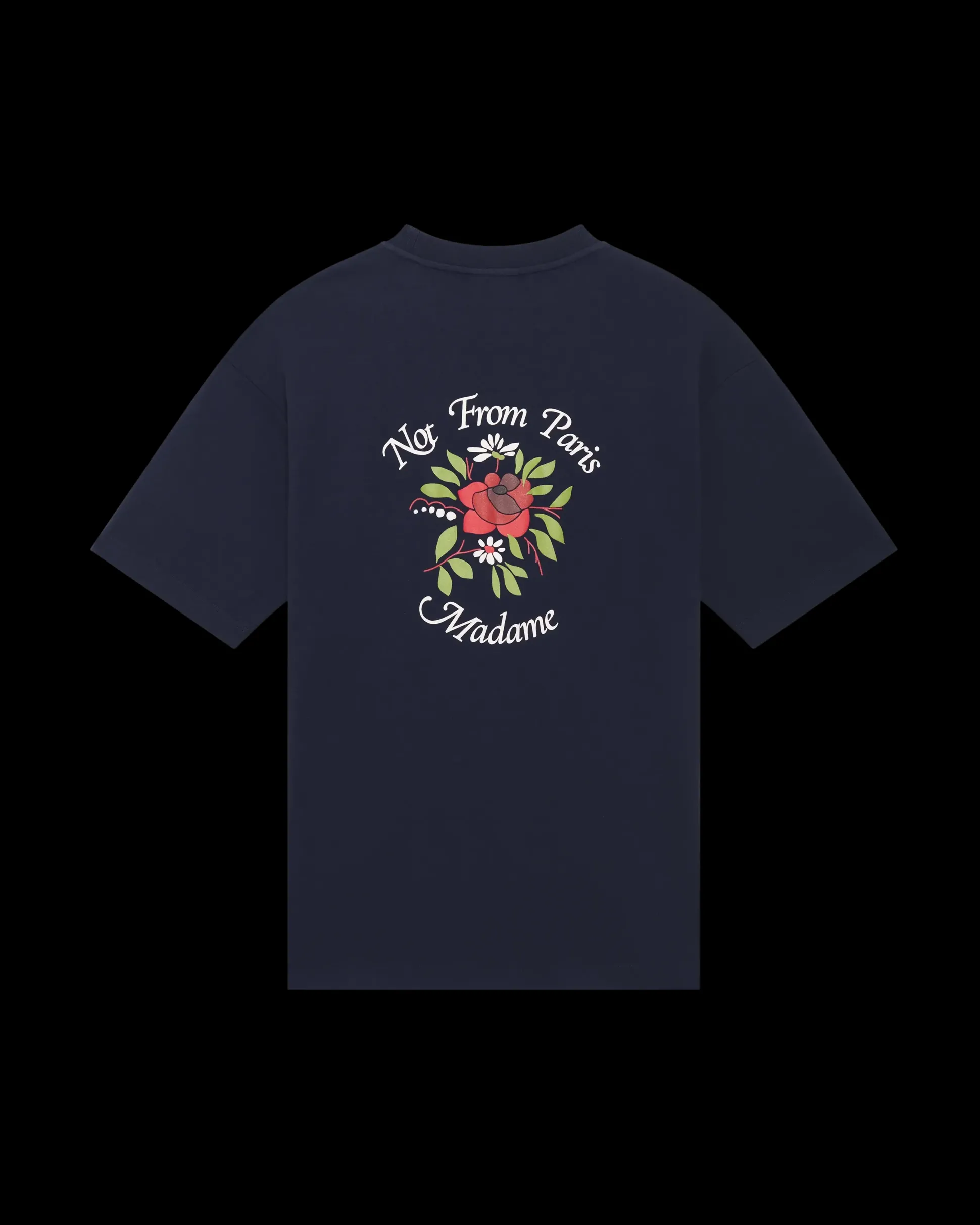 This navy 100% cotton interlock t-shirt with a ribbed neckline features the ‘Slogan Fleurs’ print on the front and back.