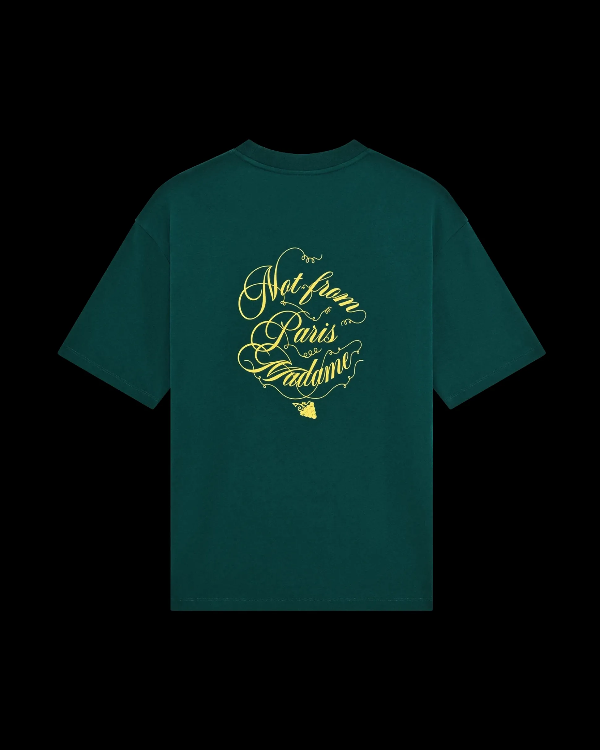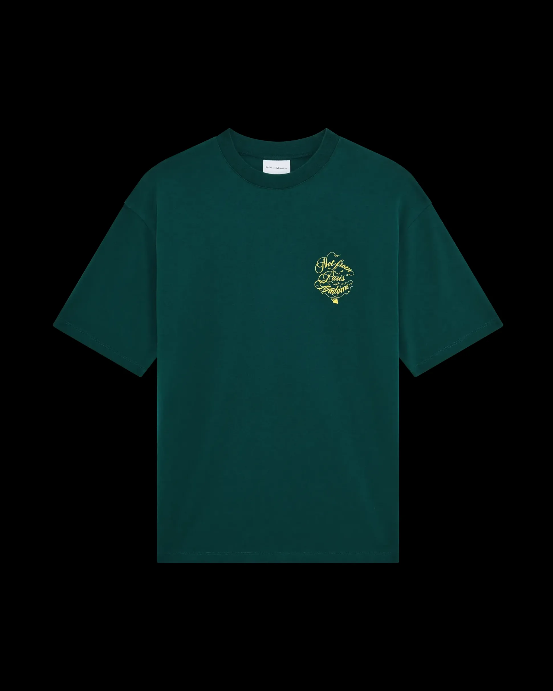 This dark green 100% cotton interlock t-shirt with a ribbed neckline features the Slogan Vignes print on the front and back.• T-shirt• Interlock fabric • Chest and back Slogan Vignes print• Ribbed neckline• 100% cotton – 240 GSMColor: Dark greenMade in Portugal