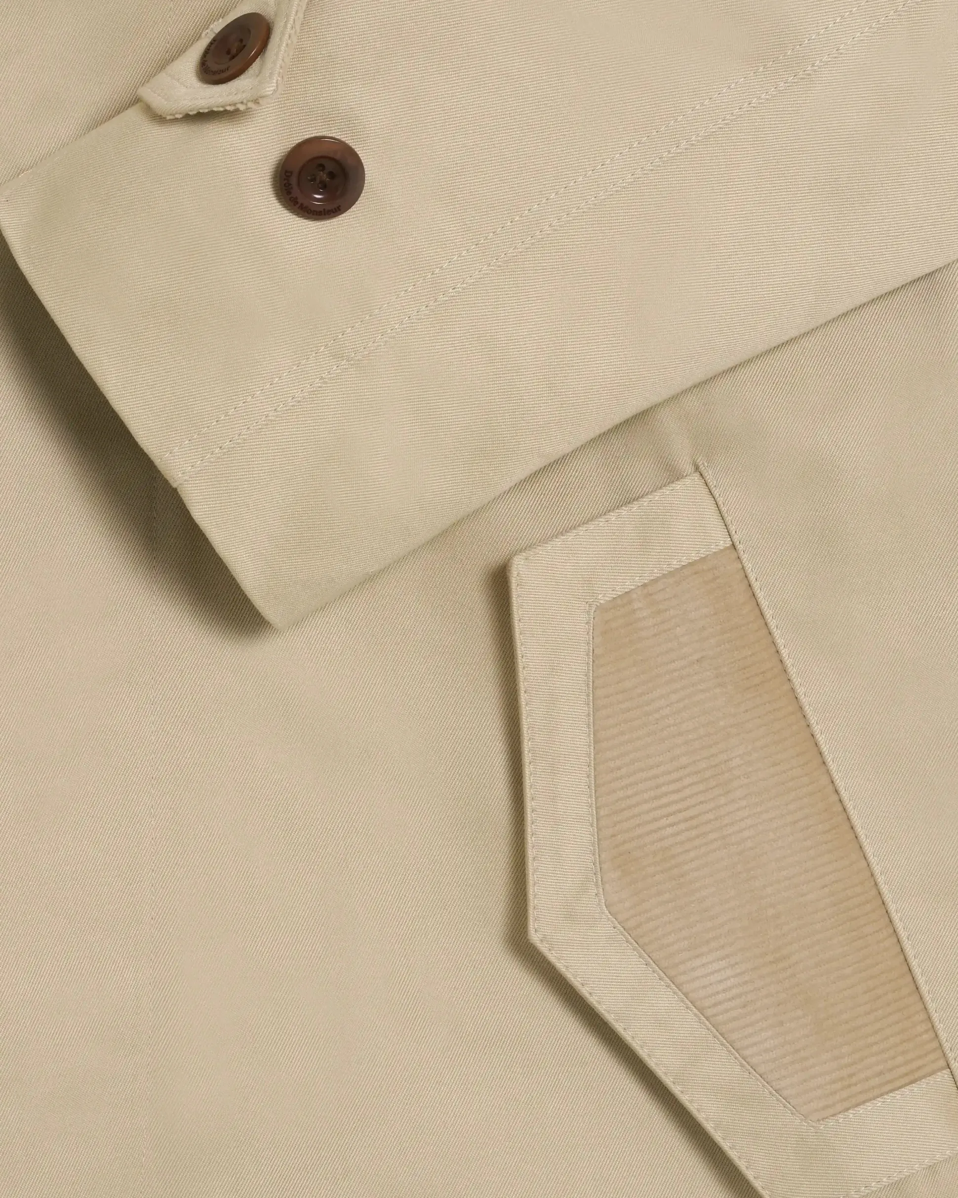• Trench coat in cotton gabardine• Corduroy inlay at collar• Raglan pocket with flap• Cuff and pocket plackets• Hidden button placket in middle front• Engraved corozo buttonMade in Europe
