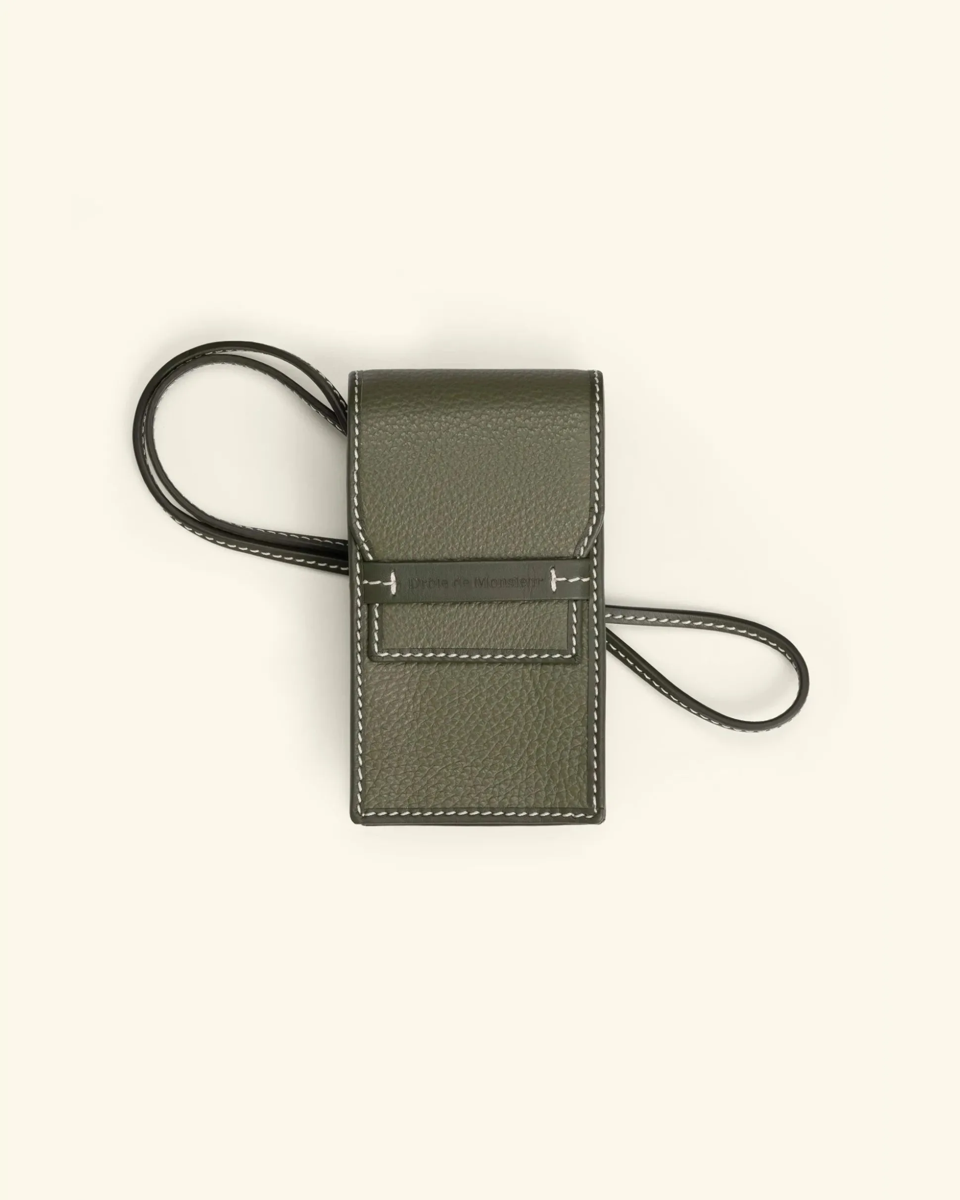 A handy accessory. This khaki camera bag is made of both smooth and grainy leather, is entirely lined with fabric and features an embossed “Drôle de Monsieur” logo.